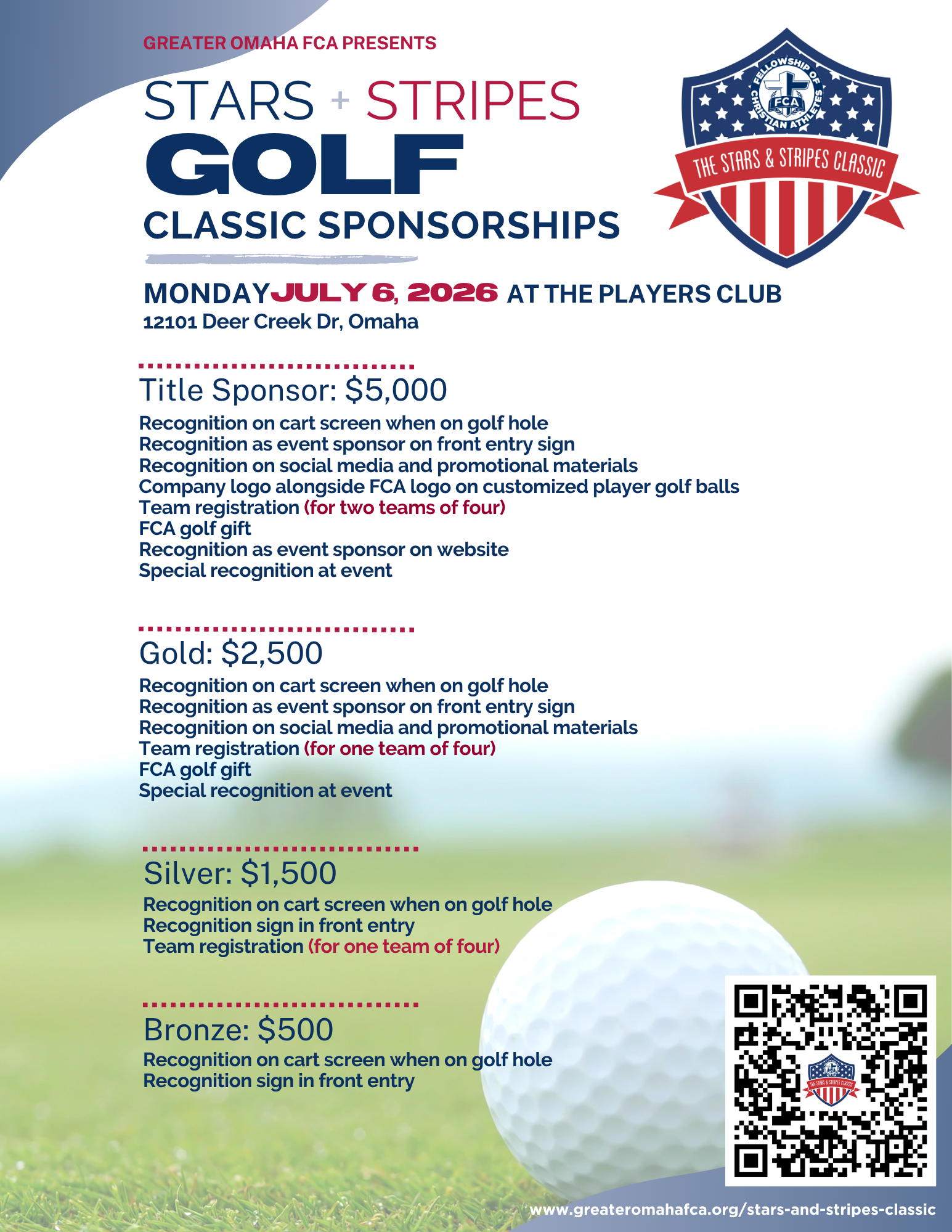 Sponsorships help to get your company's name out in front of our golfers, are a charitable contribution to FCA, and therefore are tax deductible for you! We invite you to prayerfully consider sponsoring this event at one of the following levels: